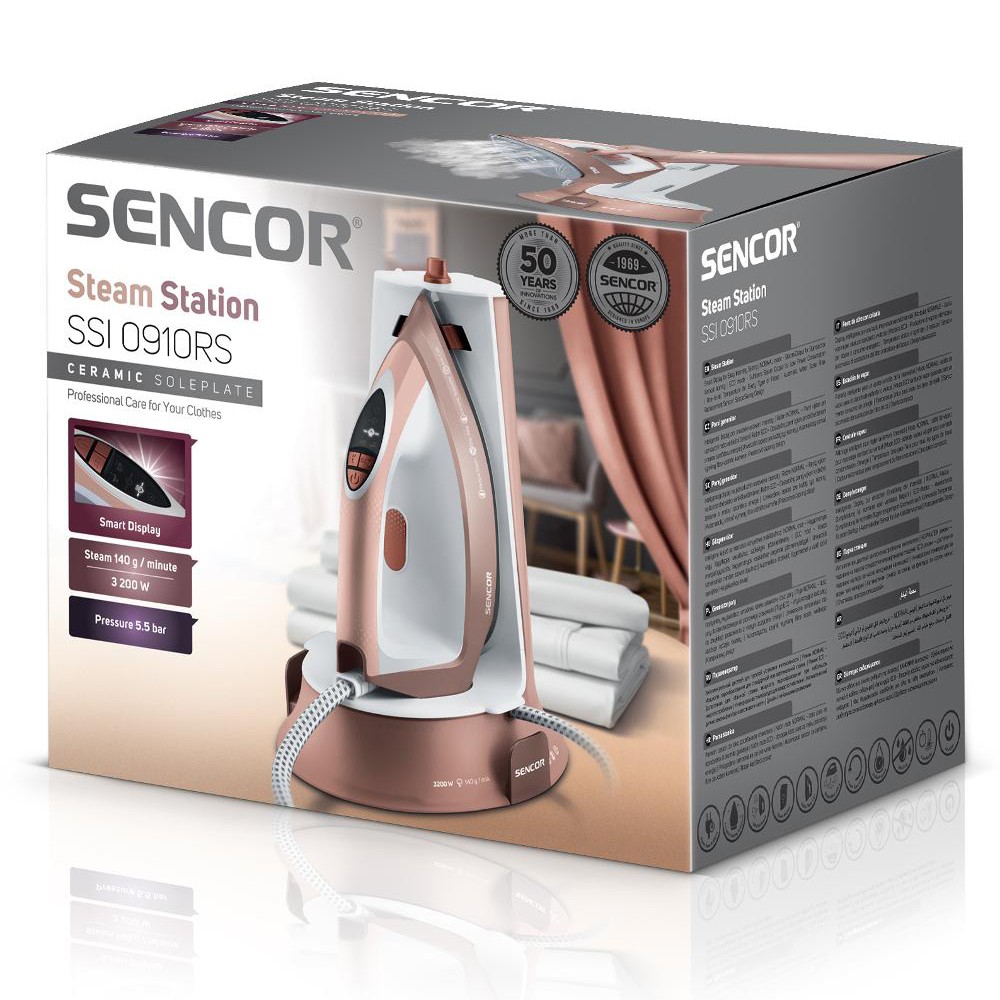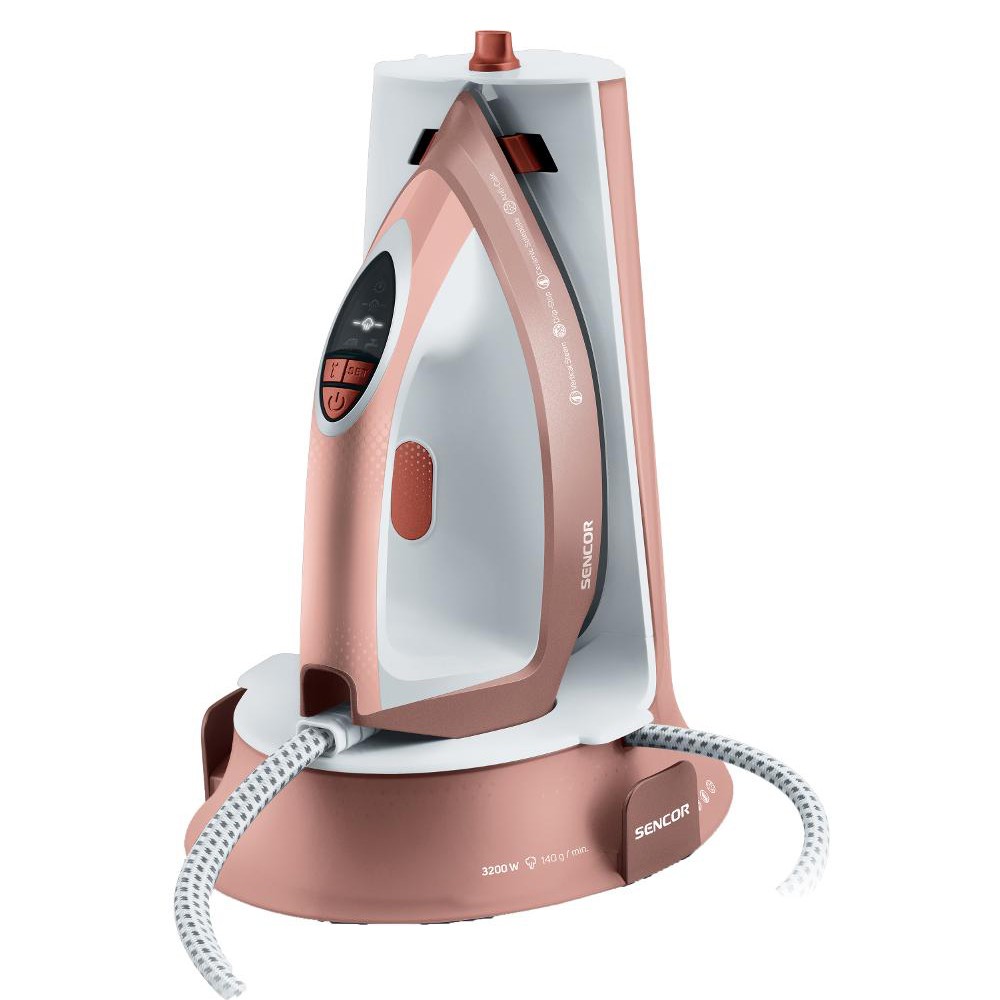 Το σιδέρωμα με το σταθμό ατμού – είναι έως και πενήντα τοις εκατό πιο γρήγορο από το σιδέρωμα με ένα τυπικό σίδερο ατμού – χάρη στη μεγάλη ποσότητα ατμού είναι πολύ απαλό στα σιδερωμένα υφάσματα – με την απουσία δοχείου νερού, η μονάδα χειρός είναι πολύ ελαφριά και άνετος στην εργασία Ο σταθμός ατμού είναι έτοιμος για σιδέρωμα εντός 35 δευτερολέπτων από την ενεργοποίηση Η ενδεικτική λυχνία υποδεικνύει ετοιμότητα για σιδέρωμα Η επιλογή κατακόρυφου σιδερώματος καθιστά δυνατό το σιδέρωμα των φορεμάτων που κρέμονται σε μια κρεμάστρα Έξυπνη οθόνη για εύκολη ρύθμιση της έντασης του ατμού. – ECO – επαρκής έξοδος ατμού για τυπικό σιδέρωμα με χαμηλή κατανάλωση ενέργειας – ΚΑΝΟΝΙΚΟ – Έξοδος ατμού για τυπικό ή κάθετο σιδέρωμα Έξοδος ατμού 140 g/min Πίεση νερού 5,5 bar Χωρητικότητα δοχείου νερού 1,3 l Δυνατότητα επαναπλήρωσης της δεξαμενής με νερό ενώ η συσκευή είναι λειτουργεί χωρίς να το απενεργοποιήσετε Λειτουργία αυτόματης απενεργοποίησης μετά από αδράνεια για 10 λεπτά Σύστημα Anti-Calc αποτρέπει τις εναποθέσεις αλάτων νερού Η τεχνολογία Anti-drip αποτρέπει ανεπιθύμητες πτώσεις στο σιδερωμένο ύφασμα Αυτόματος αισθητήρας υποδεικνύει την ανάγκη αντικατάστασης του φίλτρου ζυγαριάς νερού Μεταβλητή θερμοκρασία και έλεγχος ατμού για βέλτιστη ρύθμιση για κάθε τύπο υφάσματος Συμπαγής σχεδιασμός Κατά τη διάρκεια της διαδικασίας σιδερώματος, μπορείτε να αφήσετε το σίδερο στην άκρη είτε στο μαξιλαράκι ανάπαυσης είτε στο υπόστρωμα της μονάδας βάσης Είσοδος ισχύος 3200 W Έξοδος ατμού: 140 g/min Ριπή ατμού: 410 g /min Πίεση νερού 5,5 bar Κεραμική πλάκα Χρόνος θέρμανσης: 35 δευτερόλεπτα Όγκος δοχείου νερού: 1,3 l Διαστάσεις σιδήρου και βάσης: 249 × 220 × 312 mm Βάρος με βάση: 2,7 kg Διαστάσεις σιδήρου: 265 × 124 × 119 mm Βάρος χωρίς τη βάση: 1,4 kg