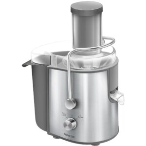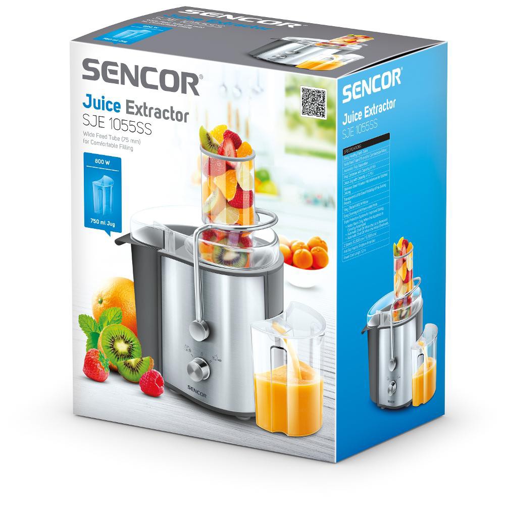 Είσοδος ισχύος 800 W Φινίρισμα από ανοξείδωτο χάλυβα για εύκολη και υγιεινή συντήρηση Αυτόματος διαχωρισμός πολτού 2 ταχύτητες (10.600 rpm / 12.600 rpm) Δοχείο πολτού χωρητικότητας 1,6 l Κανάτα χυμού χωρητικότητας 0,75 l Ευρύς σωλήνας τροφοδοσίας (75 mm) Σύστημα τριπλής προστασίας για βελτιωμένο ασφάλεια Ο κινητήρας ξεκινά μόνο όταν η συσκευή έχει συναρμολογηθεί σωστά Αυτόματο σβήσιμο όταν αφαιρείται το καπάκι Αυτόματο σβήσιμο όταν ο κινητήρας υπερθερμαίνεται Αντιολισθητικά πόδια για χρήση χωρίς προβλήματα Μήκος καλωδίου ρεύματος: 1,2 m Διαστάσεις (μήκος × πλάτος × ύψος): 280 × 170 × 390 mm Βάρος: 3,6 kg