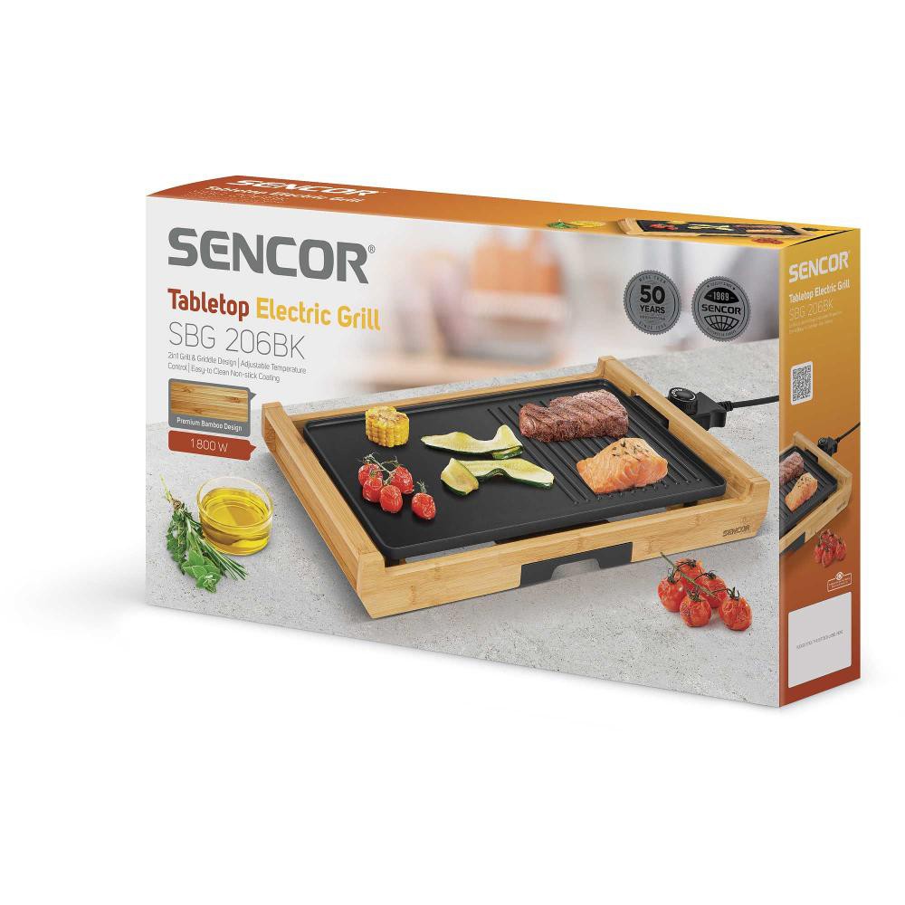 Επιτραπέζια Ηλεκτρική Ψηστιέρα 2 in 1 Premium Bamboo Sencor SBG 206BK. Ρυθμιζόμενος έλεγχος θερμοκρασίας Εύκολος καθαρισμός Μεγάλη επιφάνεια μαγειρέματος (43 × 23 cm) Κανάλια λίπους για πιο υγιεινό μαγείρεμα Ανθεκτικές στη θερμότητα λαβές για ασφαλή μεταφορά Αποσπώμενος θερμοστάτης Αποσπώμενος αφαιρούμενος αντιολισθητικός δίσκος σταγόνων για Easy C Πόδια Ισχύς εισόδου 1800 W Μέγ.