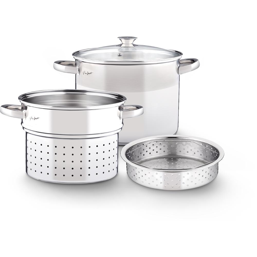 ΖΥΜΑΡΙΚΑ 6 ΛΙΤΡΩΝ ΚΑΤΑΣΚΕΥΗ ΜΕ ΣΥΡΓΗΓΙΣΤΗ ΚΑΙ ΚΑΛΑΘΙ ΑΤΜΟΠΟΙΗΣΗΣ. Η κατσαρόλα ζυμαρικών με σουρωτήρι και καλάθι ατμού είναι κατασκευασμένη από πρώτης τάξεως ανοξείδωτο ατσάλι 18/0 και διαθέτει συμπαγή βάση. Το εσωτερικό δοχείο χρησιμεύει ως φίλτρο με τις δικές του άνετες λαβές για ξεχωριστό χειρισμό. Περιλαμβάνεται ένα εσωτερικό καλάθι ατμού με ενσωματωμένες λαβές. Το καπάκι είναι κατασκευασμένο από ανθεκτικό γυαλί με έξοδο ατμού για ακριβή έλεγχο μαγειρέματος.
