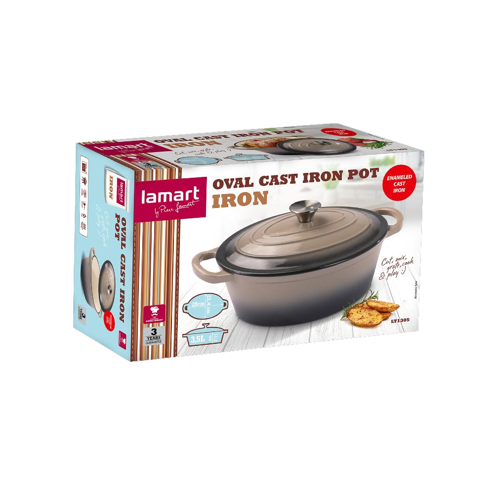 Η oval κατσαρόλα Lamart LT1305 από εμαγιέ μαντέμι διαθέτει εσωτερική και εξωτερική επίστρωση σμάλτου που αντιστέκεται στις φθορές και στις ρωγμές, αντέχει σε υψηλές θερμοκρασίες έως 280°C, είναι κατασκευασμένη από υψηλής ποιότητας μαντέμι με αντικολλητική επίστρωση σμάλτου και διαθέτει μεγάλες εργονομικές λαβές για ομοιόμορφη κατανομή βάρους και ασφαλές κράτημα.