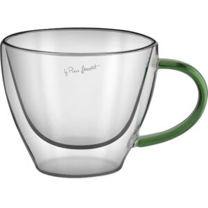 Σετ 2 γυάλινων φλιτζανιών καπουτσίνο VASO Lamart LT9115, κατάλληλο για ζεστά και κρύα ροφήματα. Κατασκευασμένα από ανθεκτικό γυαλί με διπλό τοίχωμα που βοηθά στη διατήρηση της θερμοκρασίας του ροφήματος. Με κομψό πράσινο χρώμα και μοντέρνο σχεδιασμό, είναι κατάλληλα για φούρνο μικροκυμάτων και πλυντήριο πιάτων.