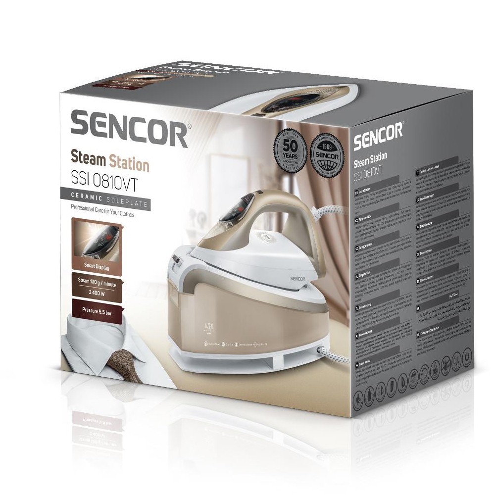 Το σιδέρωμα με το σταθμό ατμού – είναι έως και πενήντα τοις εκατό πιο γρήγορο από το σιδέρωμα με ένα τυπικό σίδερο ατμού – χάρη στη μεγάλη ποσότητα ατμού είναι πολύ απαλό στα σιδερωμένα υφάσματα – με την απουσία δοχείου νερού, η μονάδα χειρός είναι πολύ ελαφριά και άνετος στην εργασία Ο σταθμός ατμού είναι έτοιμος για σιδέρωμα εντός 35 δευτερολέπτων από την ενεργοποίηση Η ενδεικτική λυχνία υποδεικνύει ετοιμότητα για σιδέρωμα Η επιλογή κατακόρυφου σιδερώματος καθιστά δυνατό το σιδέρωμα των φορεμάτων που κρέμονται σε μια κρεμάστρα Έξυπνη οθόνη για εύκολη ρύθμιση της έντασης του ατμού. – ECO – επαρκής έξοδος ατμού για τυπικό σιδέρωμα με χαμηλή κατανάλωση ενέργειας – ΚΑΝΟΝΙΚΟ – Έξοδος ατμού για τυπικό ή κάθετο σιδέρωμα Έξοδος ατμού 130 g/min Πίεση νερού 5,5 bar Χωρητικότητα δοχείου νερού 1,3 l Δυνατότητα επαναπλήρωσης της δεξαμενής με νερό ενώ η συσκευή είναι λειτουργεί χωρίς να το απενεργοποιήσετε Λειτουργία αυτόματης απενεργοποίησης μετά από αδράνεια για 10 λεπτά Σύστημα Anti-Calc αποτρέπει τις εναποθέσεις αλάτων νερού Η τεχνολογία Anti-drip αποτρέπει ανεπιθύμητες πτώσεις στο σιδερωμένο ύφασμα Αυτόματος αισθητήρας υποδεικνύει την ανάγκη αντικατάστασης του φίλτρου ζυγαριάς νερού Μεταβλητή θερμοκρασία και έλεγχος ατμού για βέλτιστη ρύθμιση για κάθε τύπο υφάσματος Συμπαγής σχεδίαση Κατά τη διάρκεια της διαδικασίας σιδερώματος, μπορείτε να αφήσετε το σίδερο στην άκρη είτε στο μαξιλαράκι ανάπαυσης είτε στο υπόστρωμα της μονάδας βάσης Είσοδος ισχύος 2 400 W Έξοδος ατμού: 130 g/min Ριπή ατμού: 395 g/min Πίεση νερού 5,5 bar Κεραμική πλάκα Χρόνος θέρμανσης: 35 δευτερόλεπτα Όγκος δοχείου νερού: 1,5 l Διαστάσεις σίδερου και βάσης: 323 x 194 x 60 mm Βάρος με βάση: 2,85 kg Διαστάσεις σιδήρου: 275 x 124 x 131 mm Βάρος χωρίς τη βάση: 1,5 kg