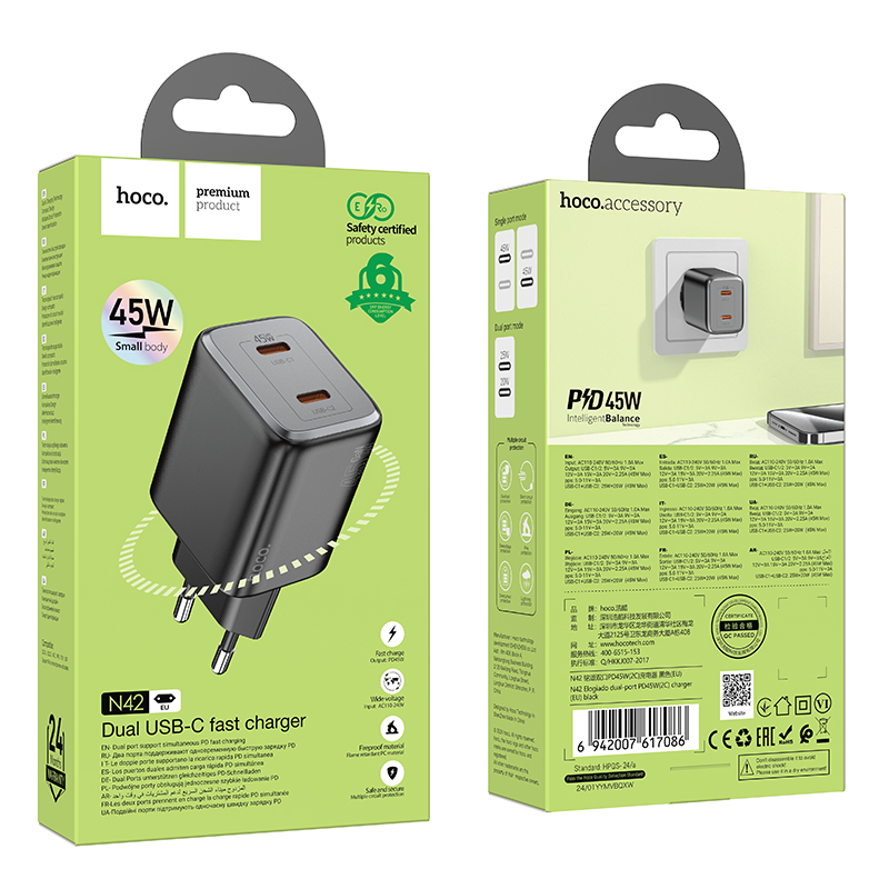 Ο Hoco N42 Elogiado είναι ένας ισχυρός φορτιστής ταξιδιού, κατασκευασμένος από επιβραδυντικό φλόγας υλικό, προσφέροντας μέγιστη ασφάλεια κατά τη χρήση. Διαθέτει δύο εξόδους Type-C με ισχύ 45W. Όταν χρησιμοποιούνται ταυτόχρονα, οι δύο θύρες παρέχουν έξοδο C1 25W + C2 20W. Με ευρωπαϊκό βύσμα (EU plug), είναι ιδανικός για ταξίδια. Το συμπαγές του μέγεθος (83x39x32mm) και το βάρος των 100g τον καθιστούν εύκολο στη μεταφορά και την αποθήκευση.