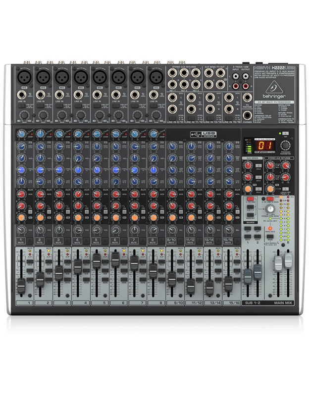 Η XENYX X2222USB σάς επιτρέπει να επιτύχετε αβίαστα ήχο κορυφαίας ποιότητας χάρη στους 8 ενσωματωμένους προενισχυτές μικροφώνου XENYX ποιότητας στούντιο και τα εξαιρετικά μουσικά semi-parametric mid band “Βritish EQ” .Oι “one-knob” compressors παρέχουν ton απόλυτο δυναμικό έλεγχο , ενώ σέβονται όλη τη δύναμική και το συναίσθημα που έχετε σε κάθε νότα σας . Προσθέστε σε όλα αυτά και τον 24-bit dual-engine επεξεργαστή Multi-FX με 16 επεξεργάσιμες προεπιλογές επαγγελματικής ποιότητας, συμπεριλαμβανομένων των reverb, chorus, fl anger, delay, pitch shifter και multi-effects – και το X2222USB γίνεται ένας απίστευτα ευέλικτος μίκτης για τις ζωντανές παραστάσεις σας.
