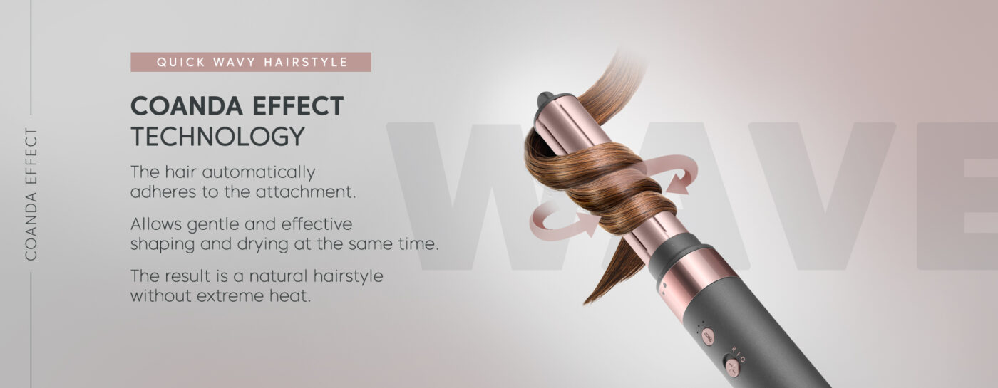 - Αυτόματο εξάρτημα Air Curling: δημιουργήστε τέλειες μπούκλες ή λεπτά κύματα χωρίς να τα φθείρετε. Το Effect Coanda πιάνει απαλά τα μαλλιά και τα κάνει αυτόματα μπούκλες, εξοικονομώντας χρόνο και προστατεύοντας τα από τη θερμότητα.