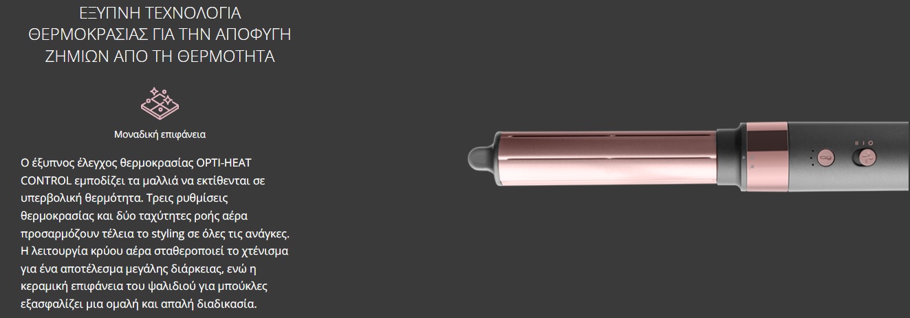 Με τον έξυπνο έλεγχο θερμοκρασίας OPTI-HEAT CONTROL , μπορείτε να είστε σίγουροι ότι τα μαλλιά σας δεν θα εκτεθούν ποτέ σε υπερβολική θερμότητα. Τρεις ρυθμίσεις θερμοκρασίας και δύο ταχύτητες ροής αέρα σάς επιτρέπουν να προσαρμόσετε τέλεια το styling σας στις ανάγκες σας. Η λειτουργία κρύου αέρα ρυθμίζει στη συνέχεια το χτένισμά σας για ένα αποτέλεσμα μεγάλης διάρκειας, ενώ η κεραμική επιφάνεια των εξαρτημάτων για μπούκλες εξασφαλίζει μια ομαλή και απαλή διαδικασία.