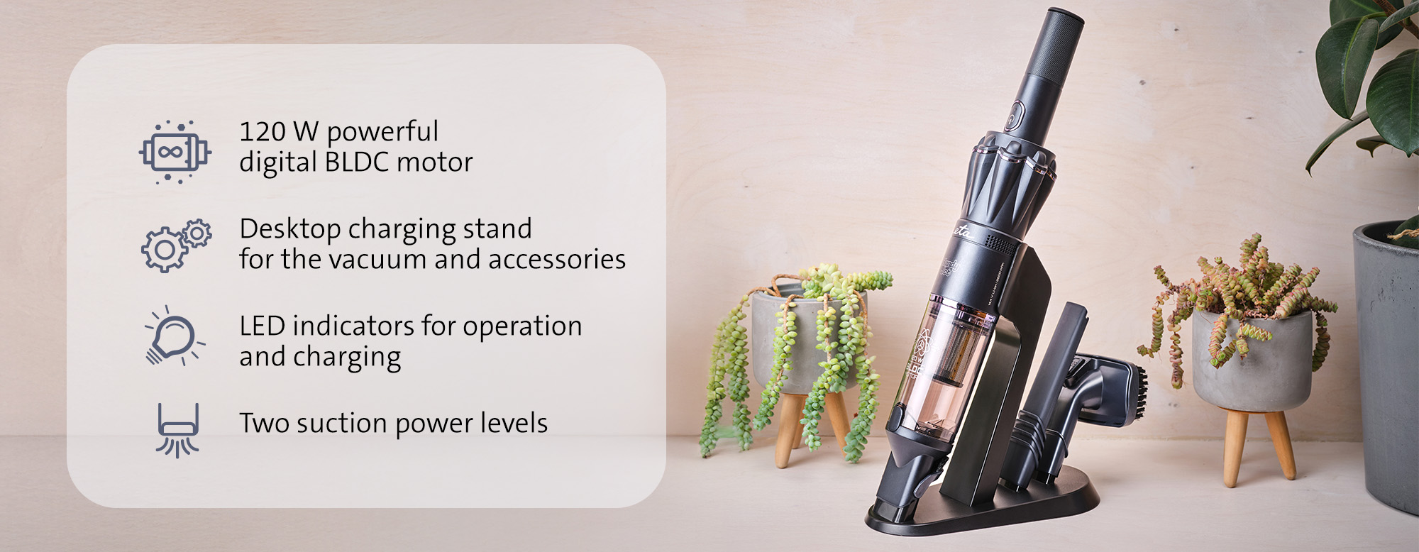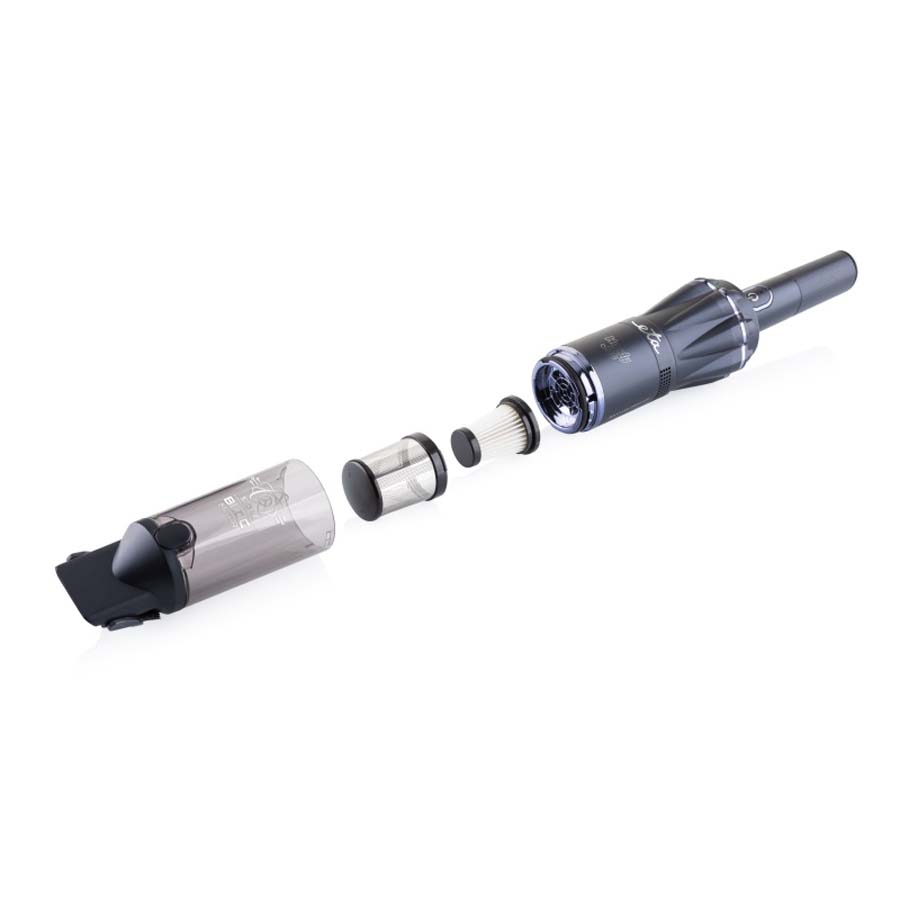 Αυτή η φορητή ηλεκτρική σκούπα συνδυάζει έναν εξαιρετικά ισχυρό ψηφιακό κινητήρα BLDC 120 W με εξαιρετικά χαμηλό βάρος μόλις 0,5 kg , προσφέροντας την καλύτερη απόδοση. Με δύο λειτουργίες αναρρόφησης, συμπαγείς διαστάσεις, φίλτρο HEPA με προφίλτρο από ανοξείδωτο ατσάλι και πρακτικά αξεσουάρ (ακροφύσιο για στενά σημεία και ακροφύσιο ταπετσαρίας), αποτελεί το τέλειο βοήθημα για γρήγορο και αποτελεσματικό καθαρισμό στο σπίτι ή στο αυτοκίνητό σας. Η τροφοδοσία παρέχεται από μια σύγχρονη μπαταρία ιόντων λιθίου (14,4 V, 2600 mAh), προσφέροντας έως και 35 λεπτά λειτουργίας με μία μόνο φόρτιση. Μετά τον καθαρισμό, απλώς τοποθετήστε την σκούπα χειρός στην κομψή βάση γραφείου, η οποία λειτουργεί τόσο ως φορτιστής όσο και ως πρακτικός χώρος αποθήκευσης αξεσουάρ.