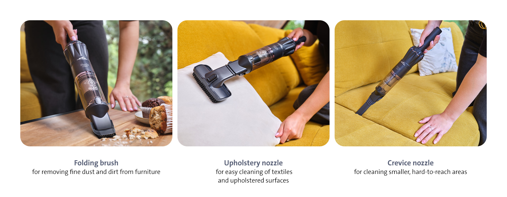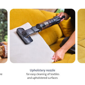 Το ακροφύσιο ταπετσαρίας καθαρίζει απαλά μαξιλάρια, υφάσματα και αλλεργιογόνα.