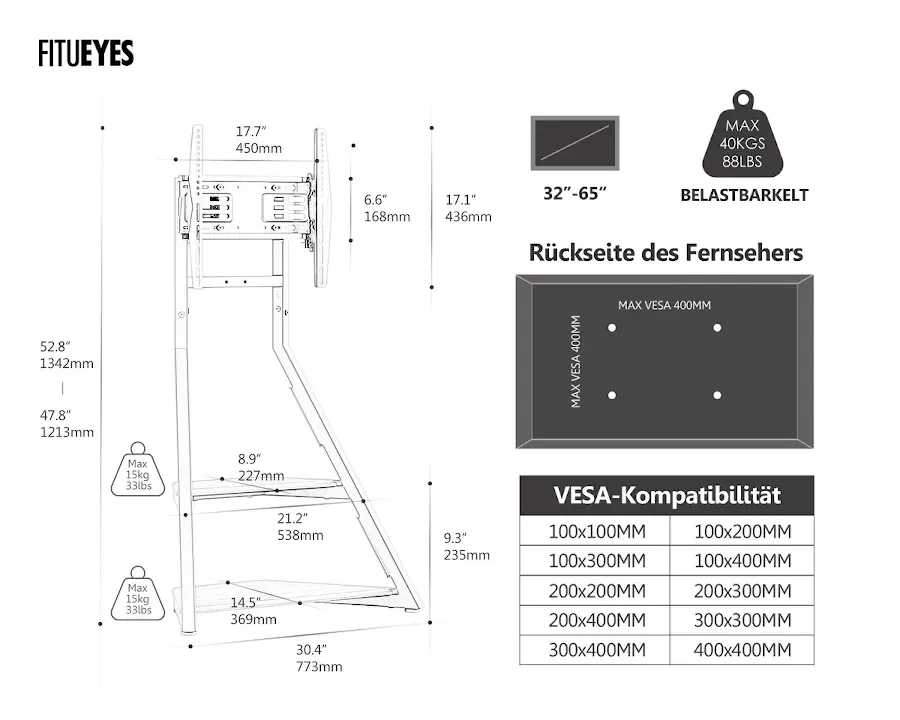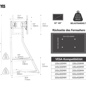 Αυτή η βάση τηλεόρασης είναι συμβατή με τις περισσότερες επίπεδες και κυρτές τηλεοράσεις μεγέθους από 32 έως 65 ίντσες , υποστηρίζοντας μέγιστο βάρος 40 κιλά . Λειτουργεί με τις περισσότερες μάρκες τηλεοράσεων και υποστηρίζει μοτίβα τοποθέτησης VESA από τουλάχιστον 100x100mm έως μέγιστο 400x400mm .