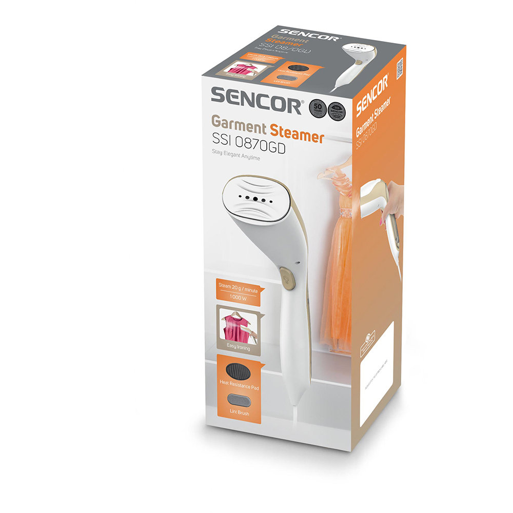 Ο Sencor SSI 0870GD ατμοκαθαριστής ρούχων με ισχύ 1.000 W προσφέρει υψηλή απόδοση ατμού 20 g/min για αποτελεσματικό σιδέρωμα. Διαθέτει σόλα αλουμινίου και αφαιρούμενη δεξαμενή νερού 75 ml. Με τη λειτουργία Drip-Stop, αποφεύγονται οι λεκέδες από νερό στα υφάσματα, ενώ η κάθετη ατμοποίηση διευκολύνει το σιδέρωμα των κρεμασμένων ρούχων. Ζεσταίνεται σε 30 δευτερόλεπτα και διαθέτει αυτόματη απενεργοποίηση για επιπλέον ασφάλεια. Περιλαμβάνει βούρτσα για υφάσματα και μαξιλάρι αντίστασης στη θερμότητα