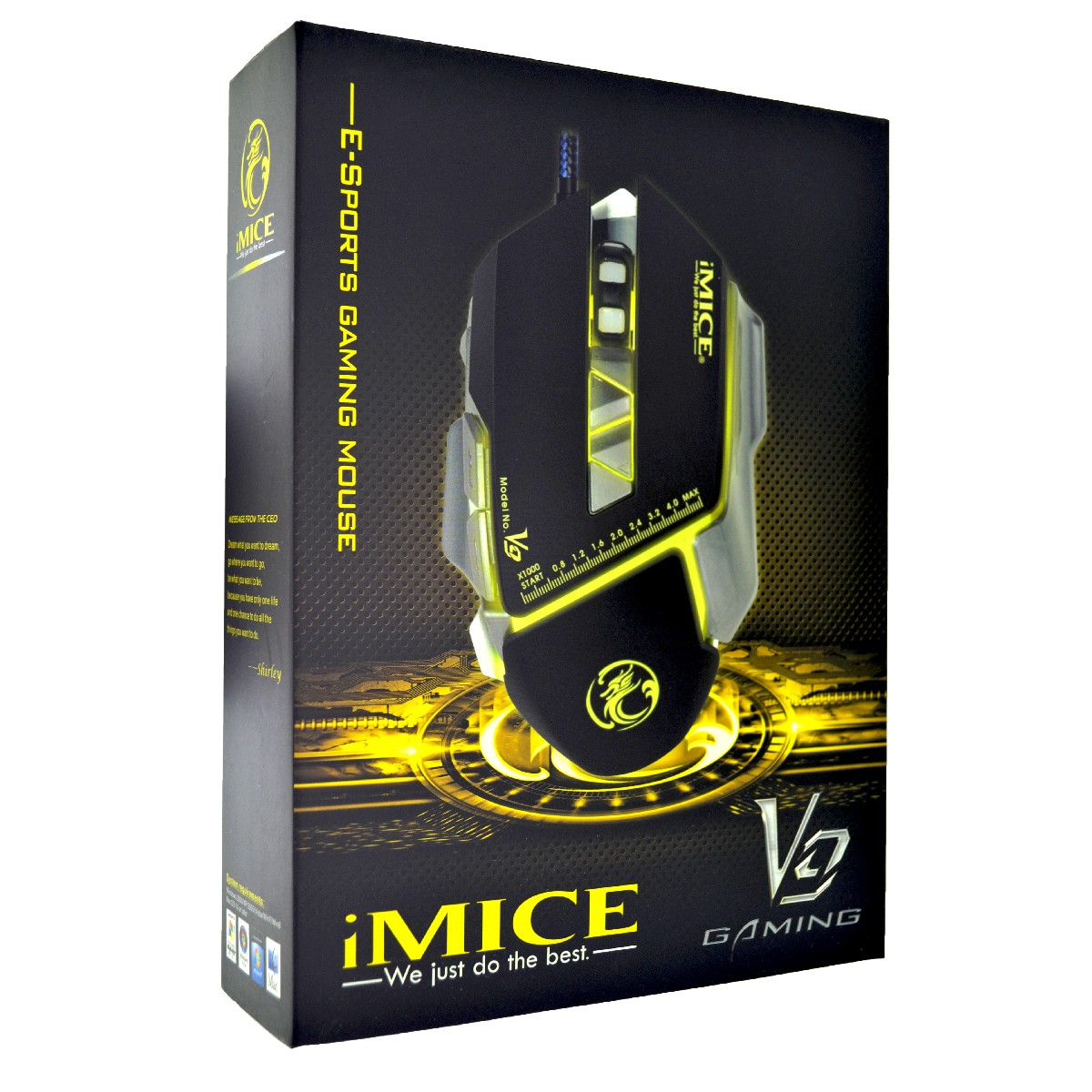 Ενσύρματο Ποντίκι iMICE V9 Gaming 7D με 7 Πλήκτρα, 2400 DPI, Multimedia και LED Φωτισμό. Μαύρο-Γκρι. Ένα εξαιρετικό ποντίκι που σχεδιάστηκε απόλυτα για τις ανάγκες κάθε gamer, αλλά και για χρήση στο γραφείο με υψηλές επαγγελματικές απαιτήσεις, έρχεται με εργονομικό σχεδιασμό και υψηλή αισθητική ενώ οι επιδόσεις του ικανοποιούν τις απαιτήσεις κάθε χρήστη. Με υψηλή ακρίβεια και φωτισμό διαφορετικών συνδυασμών που καθορίζονται από τον χρήστη με ειδικό λογισμικό τεχνολογίας LED Breathing Light 4 χρωμάτων. Η ρύθμιση της ανάλυσης γίνεται σε 4 επίπεδα ικανά να προσαρμοστούν με τις εκάστοτε απαιτήσεις του χρήστη. Ο σχεδιασμός επιτρέπει σε δεξιόχειρες και αριστερόχειρες χρήστες να απολαμάνουν την ίδια εμπειρία χρήσης ενώ στην βάση του ποντικιού υπάρχει ειδική επένδυση για πιο απαλή ολίσθηση στην επιφάνεια. Συμβατό με κάθε λειτουργικό με plug and play σύνδεση. Ανάλυση: 800/1200/1600/2400 DPI, Πλήκτρα: 7. Ταχύτητα Frame: 4000 fps, Μέγιστη ταχύτητα: 30 in/s Ρυθμός-Συχνότητα: 125 Hz/s, Τάση: 5V 100 mA