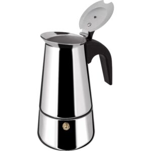 Καφετιέρα για παραδοσιακή προετοιμασία ιταλικού espresso με drip μέθοδο, κατασκευασμένη από υψηλής ποιότητας ανοξείδωτο ατσάλι 18/10. Διαθέτει κομψό κωνικό σχεδιασμό και εργονομική πλαστική λαβή για άνεση στη χρήση. Ενσωματωμένη βαλβίδα ασφαλείας για προστασία από υπερπίεση. Είναι κατάλληλη για την προετοιμασία 4 φλιτζανιών καφέ και μπορεί να χρησιμοποιηθεί σε όλες τις εστίες, συμπεριλαμβανομένων των επαγωγικών.