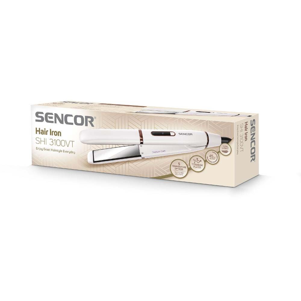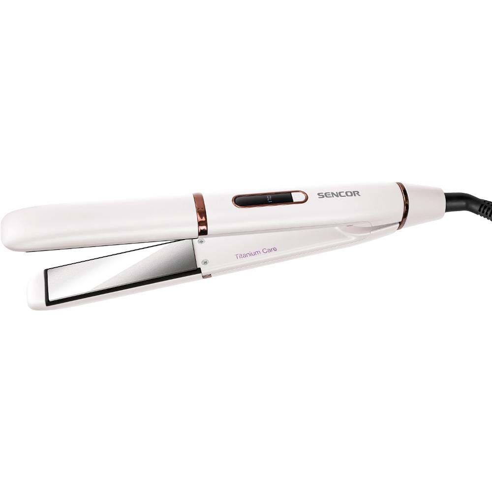 Πρέσσα μαλλιών απο τη Sencor. Με 5 ρυθμίσεις θερμοκρασίας 150/170/190/220/230 °C. Με πλάκες τιτανίου για τέλειο και κομψό αποτέλεσμα. Σχεδιασμός κατάλληλος για ίσιωμα και στυλιζάρισμα μπούκλας. Με ασφάλεια ανοίγματος και κλεισίματος. Ψηφιακή οθόνη με λευκό οπίσθιο φωτισμό. Χρόνος προθέρμανσης στους 180 °C: 1 λεπ. Χρόνος προθέρμανσης στους 220 °C: 2 λεπτά. Επιφάνεια πλάκας σιδερώματος: 100 × 25 mm. Διαστάσεις (μήκος × βάθος × ύψος): 285 × 32 × 36 mm. Βάρος: 235 g