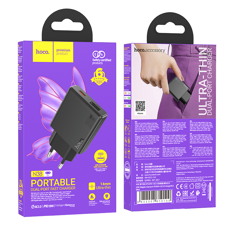 Φορτιστής Ταξιδίου Hoco N38 Delgado Ultra Thin με 2 Εξόδους Φόρτισης 1xUSB-C PD20W και USB-A QC3.0A Μαύρος