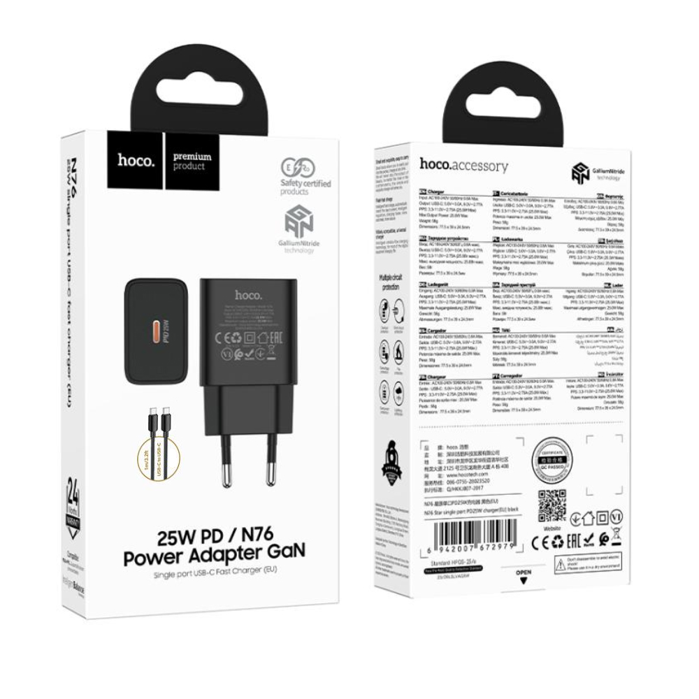 Φορτιστής Ταξιδίου Hoco N76 Star GaN 25W Fast Charge με 1xUSB-C και Καλώδιο USB-C σε USB-C Μαύρος