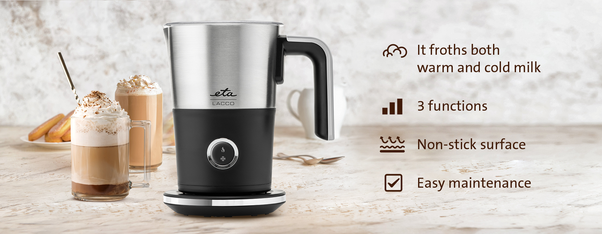 - 3 λειτουργίες: ζεστό αφρόγαλα, κρύο αφρόγαλα – ιδανικό για παγωμένο καφέ, ζέσταμα γάλακτος