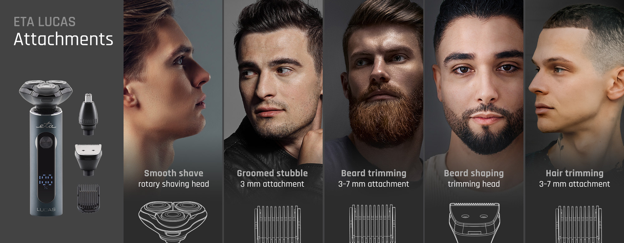 Εξοικονομήστε χώρο στο μπάνιο σας – η ETA Lucas κάνει περισσότερα από το απλό ξύρισμα, κάνοντας τη δουλειά πολλών προϊόντων ταυτόχρονα. Με την αποσπώμενη κεφαλή κοπής, μπορείτε εύκολα να κόψετε τα γένια σας, να τριμάρετε τα μαλλιά σας ή να αφαιρέσετε τις ανεπιθύμητες τρίχες από τη μύτη, τα αυτιά και τα φρύδια σας. Τα διαφορετικά εξαρτήματα σάς επιτρέπουν να πετύχετε ακριβώς το στυλ που θέλετε – από ένα τέλεια λείο πρόσωπο έως ένα ακριβές κούρεμα γενειάδας.