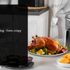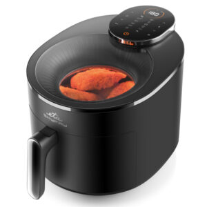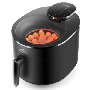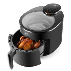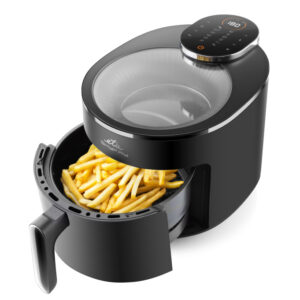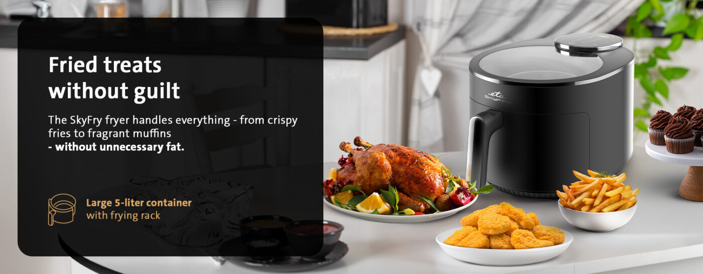 Απολαύστε τηγανητές λιχουδιές χωρίς τύψεις! Η φριτέζα θερμού αέρα ETA Skyfry με πρακτικό διαφανές κάλυμμα “τηγανίζει” το φαγητό χρησιμοποιώντας θερμό αέρα ομοιόμορφα από όλες τις πλευρές. Χάρη στο μεγάλο δοχείο 5 λίτρων με σχάρα τηγανίσματος, μπορείτε να ετοιμάσετε ζουμερές μπριζόλες κοτόπουλου, χρυσαφένιες τηγανητές πατάτες, σπιτικά φαλάφελ και τραγανά λαχανικά – με ελάχιστη προσθήκη λίπους .