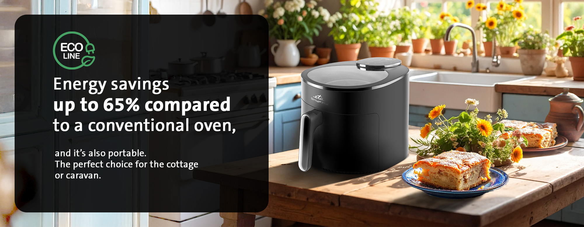 Θέλετε να εξοικονομήσετε ενέργεια; Τότε ο φούρνος ETA SkyFry θα είναι ιδανικός για εσάς. Μπορείτε επίσης να τον χρησιμοποιήσετε ως μεταφερόμενο φούρνο. Σε σύγκριση με έναν κλασικό, έχει έως και 65% λιγότερη κατανάλωση ενέργειας και είναι συμπαγής. Μπορείτε εύκολα να τον πάρετε μαζί σας σε ένα εξοχικό ή ακόμα και σε διακοπές με τροχόσπιτο.