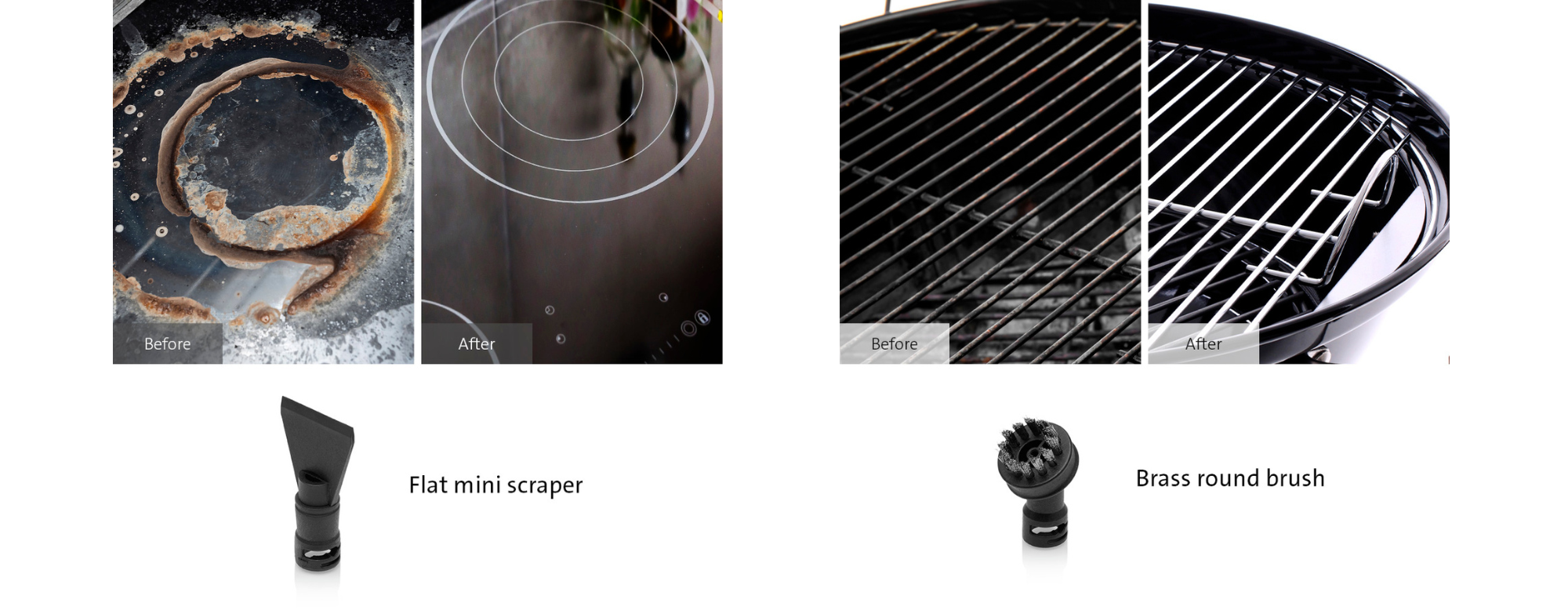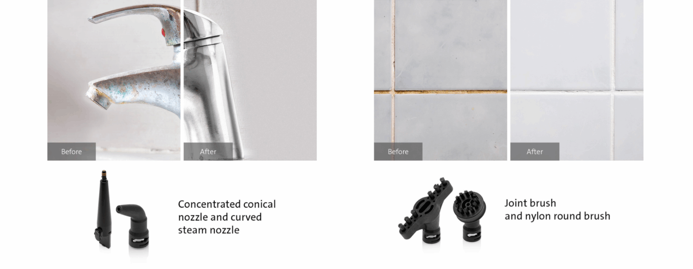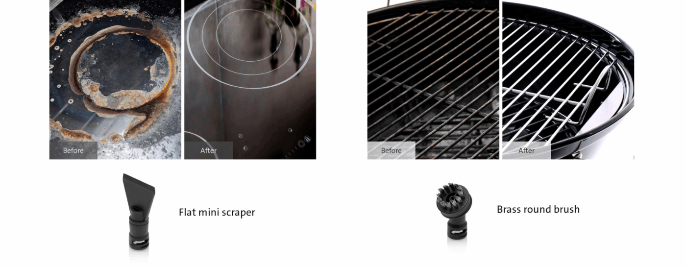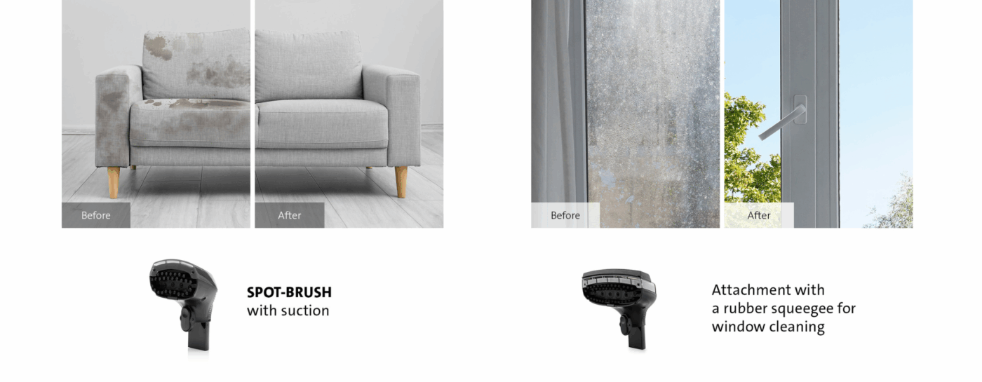 Είτε θέλετε να καθαρίσετε παράθυρα, καθρέφτες, νεροχύτες, καλοριφέρ ή το εσωτερικό του αυτοκινήτου, το ETA Steam&Clean είναι έτοιμο με μια μεγάλη γκάμα αξεσουάρ. Με βούρτσες καθαρισμού, μάκτρα και ακροφύσια, μπορείτε εύκολα να αφαιρέσετε τυχόν βρωμιά. Για πιο απαιτητικές εργασίες, μπορείτε να χρησιμοποιήσετε, για παράδειγμα, μια ορειχάλκινη βούρτσα ή ένα κυρτό ακροφύσιο. Και αν χρειάζεται να συμπληρώσετε το νερό σας, το πρακτικό άνοιγμα συμπλήρωσης σάς επιτρέπει να το κάνετε ακόμα και κατά τον καθαρισμό.