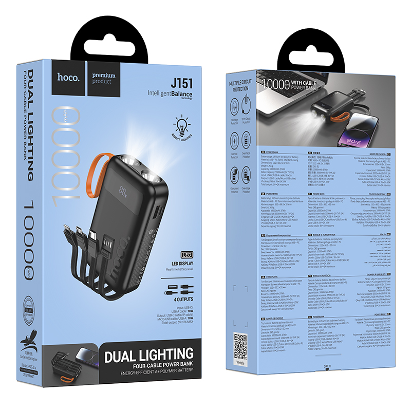 Powerbank χωρητικότητας 10000mAh (37Wh) εισόδους USB-C και USB-A με 5V/2A, και εξόδους USB-C, USB-A, Micro και IP καλώδια με 5V/2A συνολική ισχύ. Διαθέτει ψηφιακή LED οθόνη για ένδειξη επιπέδου μπαταρίας, κατασκευασμένο από ανθεκτικό πυρίμαχο υλικό ABS+PC με μπαταρία λιθίου πολυμερούς. Οι διαστάσεις του είναι 112×66.2x32mm και ζυγίζει 265g, προσφέροντας αξιόπιστη και ασφαλή φόρτιση εν κινήσει.