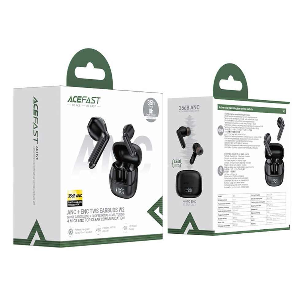 Wireless Earphones Hands Free Acefast W2 TWS v5.4 400mAh 8hr Λειτουργίας ANC και 4-Mic ENC Τεχνολογία IPX4 με LED Display Μαύρα
